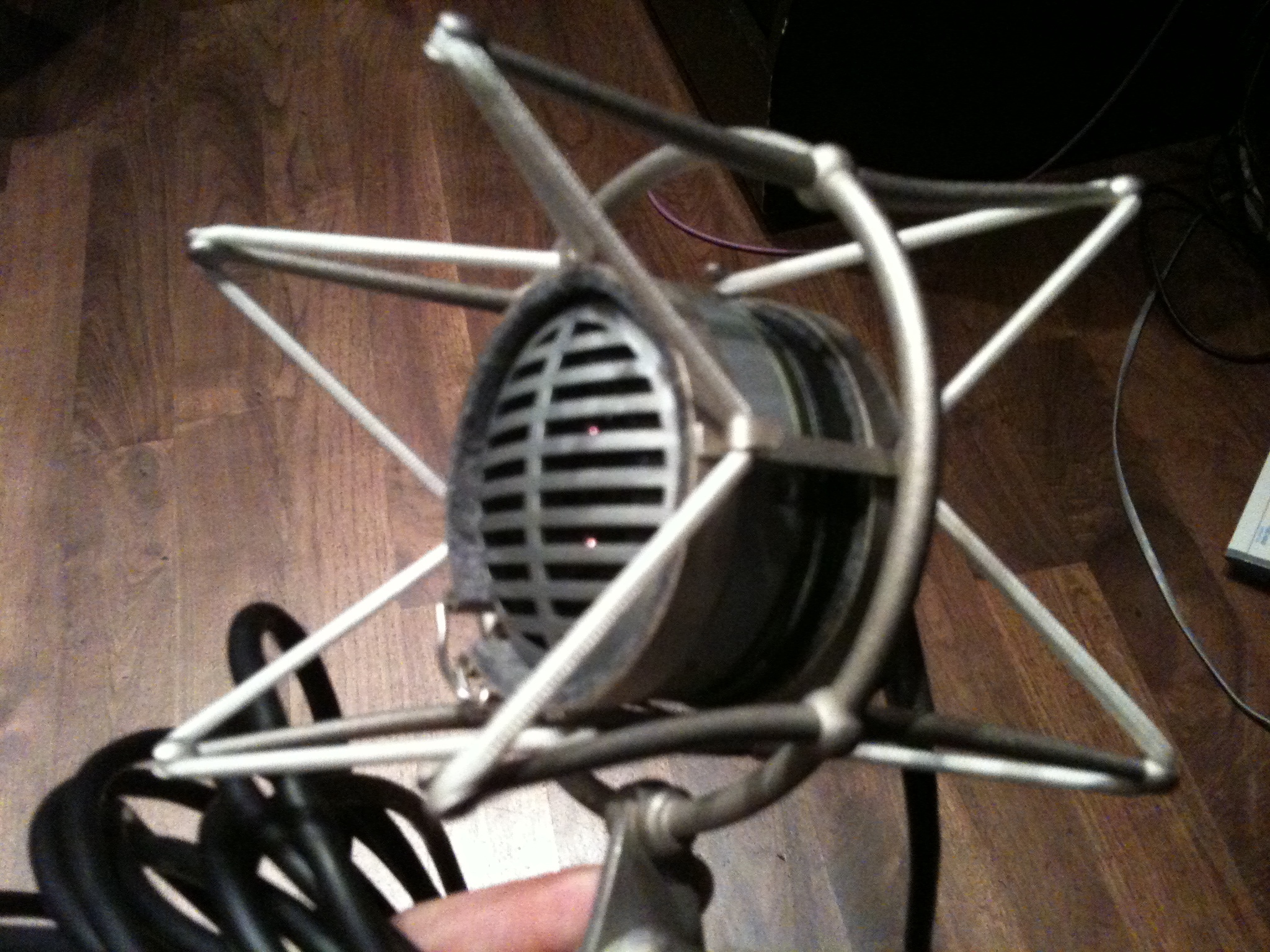Behold, for I give unto you, the Shure bullet mic shock mount. With this, I am now an “Audio Inventor.” George Massenburg, you may have invented the parametric EQ, Les Paul, you may have invented multitrack recording, and Muddy Waters, you may have invented electricity, but now all of you must step aside and witness, in all of its glory, the bullet mic shock mount.