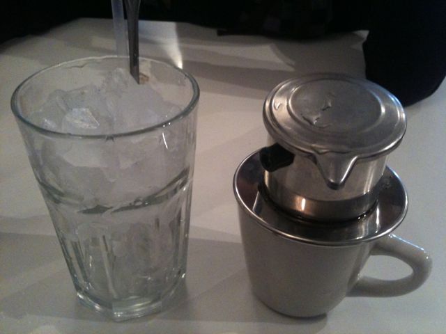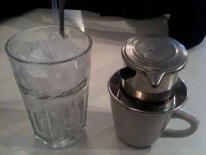The coffee comes out in a small brewing vessel that is on top of a coffee mug that is part-way filled with sweetened, condensed milk. The coffee drips out of the silver vessel, and in to the mug. After the coffee has finished dripping into the mug, you need to stir the contents of the mug. The milk and coffee will mix, and you’ll get a delicious coffee drink. Next, you must pour the contents of the mug into the glass of ice. If you pour too slowly, beware, the coffee will want to run down the side of the mug, instead of pouring in to the glass. You have to be quick and pour with confidence. If there are any ice cubes that are cup shaped, beware, because you might just hit that cube with the quick flowing coffee, and it could spill out all over the table. So, turn any cup shaped ice cubes upside down! Next, stir and enjoy