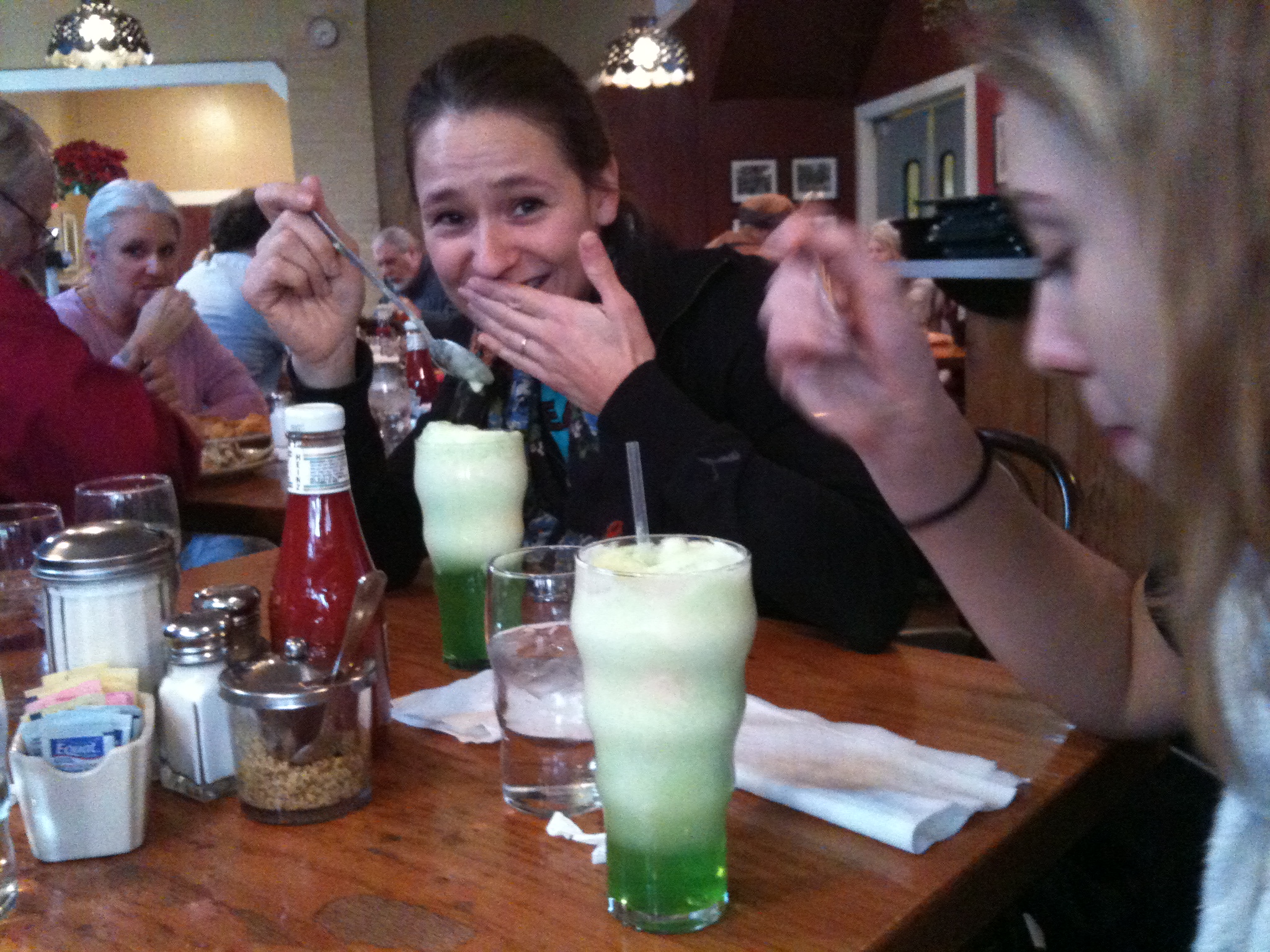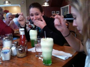 Angie and her niece, Katy, having a Green River Float at the Hobnob Corner Restaurant in Nashville, Indiana. Lemon-lime phosphate with ice cream…